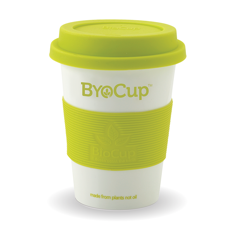Bring your own cup. Our reusable cups are made from bioplastic, derived from plants not oil. They are BPA free, dishwasher and microwave safe.