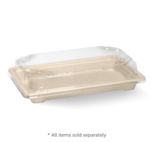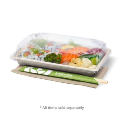 - Our sushi trays with lids have sugarcane bases and plant-based bioplastic lids – which results in 75% less greenhouse gases than the conventional plastic it replaces. - Our disposable sushi tray bases plastic-free, made from reclaimed and rapidly renewable sugarcane pulp – a by-product remaining after the juice has been extracted that would otherwise be burned. - Our bioplastic sushi tray lids have an anti-fog additive that allow for crystal clear presentation. - These takeaway food containers are grease and water resistant, with a leak-proof and secure lid – perfect for food deliveries. - Sugarcane packaging products are microwave safe and oven proof up to 220°C for 20 mins and refrigerator/freezer safe. - Sugarcane products are certified home compostable to Australian AS5810 and European NF T51-800 standards and commercially compostable to Australian AS4736 and European EN13432 standards. - Our BioCane range which includes the BioCane sushi tray base is the only sugarcane packaging certified home compostable in Australia and New Zealand. - The sushi tray bioplastic lids are certified commercially compostable to AS4736 and are designed to be part of the circular economy. Learn about composting with the BioPak Compost Service! - Bioplastics must be stored out of direct sun and below 35°C. If stored correctly, the bioplastic lids have a 12-month shelf life from the date of purchase.